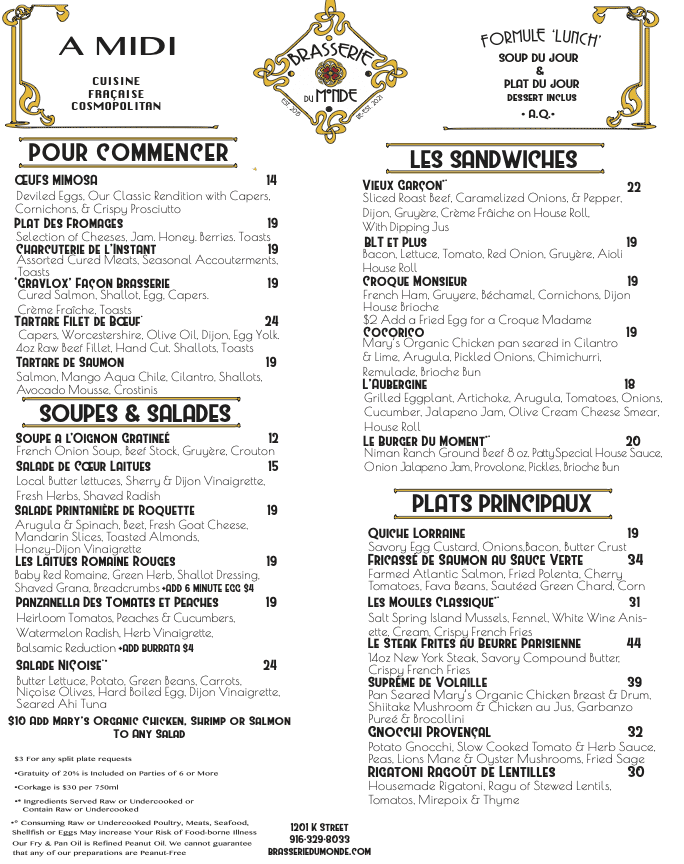 Brasserie Du Monde . 916.329.8033 . 1201 K Street . Sacramento 95814